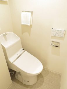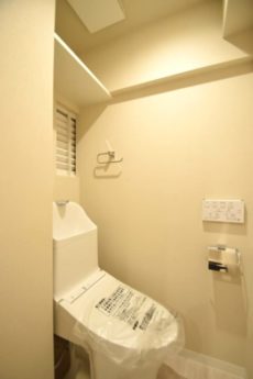 トイレは洗浄機能一体型。トイレットペーパーのストックや掃除道具を入れておくのに便利な吊戸棚も付いています。