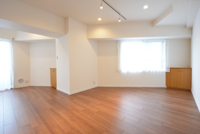 こちらは約13帖の洋室。二面採光で明るく風通しが良さそうなお部屋です。