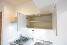 吊戸棚が低い位置に設置されていて助かります。これで踏み台も必要ありません。オープンキッチンですので、調理中は換気扇をお忘れなく!