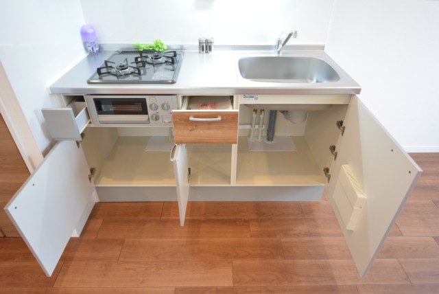 調理台下は全て収納になっています。扉タイプは奥の方が出し入れしづらいので、収納グッズなどを上手く使うといいですね。