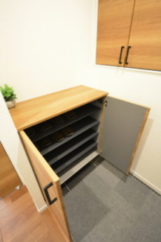 シューズボックスはロータイプ。上はカウンターとして色々飾ったりする事が出来ます。その他に上部には収納棚がありました。奥行きが深くかなり収納力がありますよ。