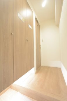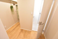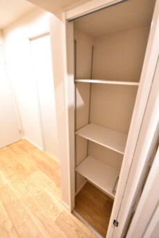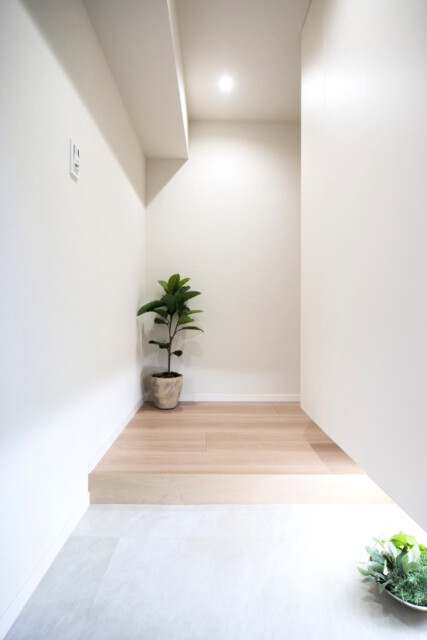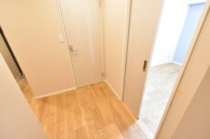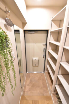 玄関から伸びる廊下は途中で左に曲がっていて、戸口から居室内が見えないようになっています。最近は宅配便やフードデリバリーを使う機会も増えていますから、プライバシー面で優れた造りといえますね。シューズボックスはオープンタイプ。風通しが良く湿気や臭いが籠ったりすることもありません。丸見えというデメリットもありますが、綺麗にディスプレイすればインテリアにもなって一石二鳥ですよ。