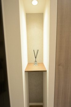 洗濯機置場にはオープン収納があるので洗剤なども近くに置けます(`・ω・´)b