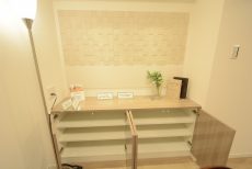 さらに続いています。途中には収納棚も付いていました。棚の高さを調整出来るので多少背の高い物でも入りますよ。カスタマイズして無駄なくスペースを使いましょう!