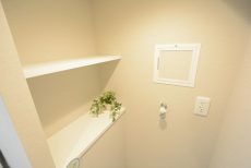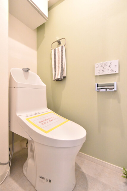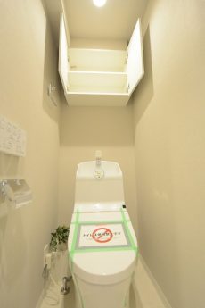 トイレはTOTO製の洗浄機能付き。掃除道具やトイレットペーパーのストックなどの収納に便利な吊戸棚も付いています。