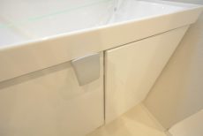 水栓はヘッドが伸びるので洗面ボウルを流したりにも便利です。収納は洗面台下と三面鏡裏のキャビネット。キャビネットは細かい物が多くなりがちな洗面には、あると嬉しい収納です。ハンドソープなどは洗面ボウルサイドの少し凹んだスペースへ置くと掃除しやすくていいですよ。