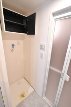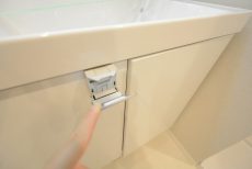 洗面室には洗面化粧台の他に洗濯機スペースと浴室、トイレがまとまっていて脱衣所も兼ねています。洗濯機スペース上部には吊戸棚が付いているので、洗濯洗剤や洗濯ネットなどのランドリー用品はこちらへどうぞ。