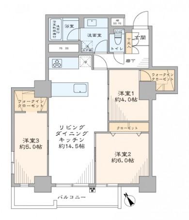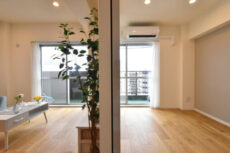 南東向きバルコニーに面したお部屋です。入口からバルコニーへ向けてキッチン、ダイニング、リビングと並べて使うオーソドックスなレイアウト。効率的で使いやすいからこそ多用されている形です。