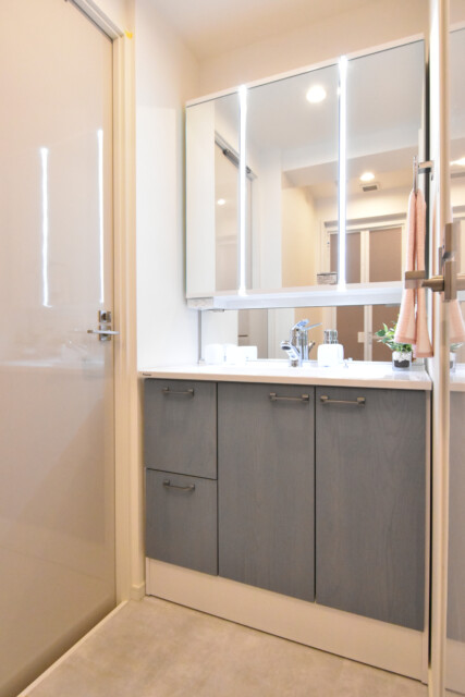 洗面化粧台は身だしなみのチェックにも便利な三面鏡付き。ミラーの間に付けられた照明のおかげで影になる心配もありません。こんな場所に付けるなんてよく思いつきましたね。低い位置に付けられたミドルミラーは小さなお子様でも使いやすく、歯磨きの習慣付けにも効果的だそうですよ。