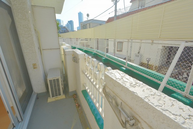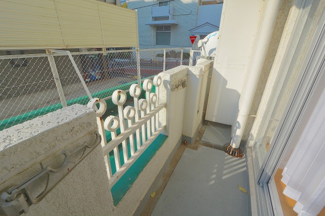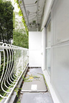 広さ3.61㎡、東向き。かわいらしい柵が印象的なバルコニーです。壁にからまるツタがバルコニー内まで侵入してきていて「天空の城ラピュタ」を思い出してしまいました(笑)外にはお隣の植栽が見えて季節感も感じられますよ。