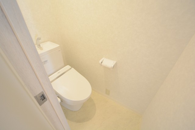 トイレは洗浄機能一体型。掃除道具の収納やトイレットペーパーのストックに便利な吊り戸棚も付いています。