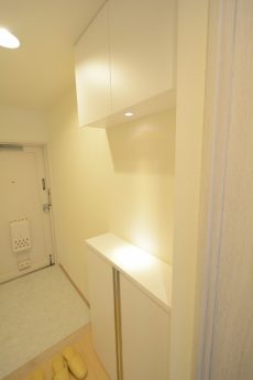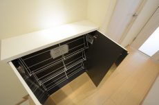 お部屋のサイズからするとゆったりめの玄関ですね。上がり口が横向きなことによって、戸口の来訪者から室内が見えづらくなっているのも嬉しいところです。照明には人感センサーが付けられ自動的にライトを点けてくれるので、暗い中手探りでスイッチを探す必要はありませんよ。トールタイプのシューズボックス付き。