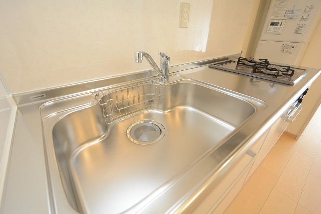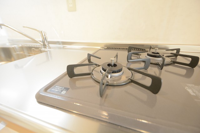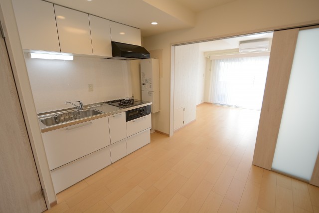 キッチンは壁面に馴染む白。水栓は浄水機能付き、コンロは3口ガスコンロです。