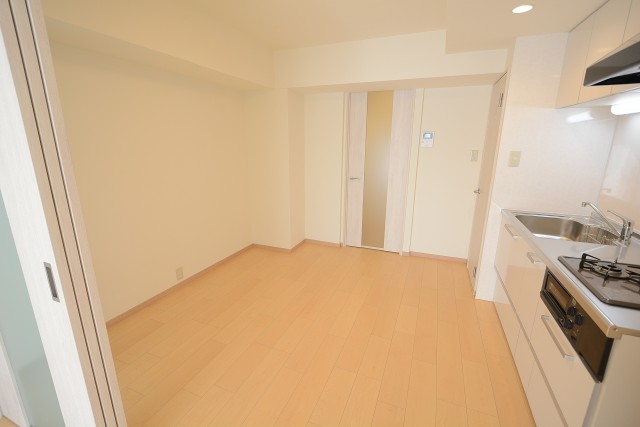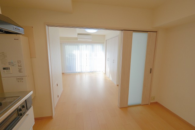 DKと洋室は引き込み式の扉で仕切られているので、全開にすればつなげてワンルームのような使い方も可能。実際、おひとり暮らしならこんな感じになると思います。DKには窓がないので特に日中はこちらがオススメですよ。