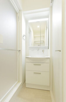 洗面室には洗面化粧台、洗濯機スペース、浴室がまとまっていて脱衣室も兼ねています。洗濯機スペースには棚が設置されているので、洗濯洗剤や洗濯ネットなどのランドリー用品を置いておくこともできますよ。
