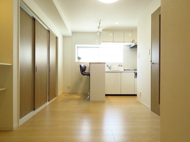 キッチン側からみたLDK。水回りの設備、洋室の扉がぐるりと並んでいます。