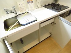 正面に窓のある明るいキッチンスペース。お料理中の熱や匂いも解消しやすいのがいいですね。水栓は浄水機能津付き、コンロは2口ガスコンロです。窓際部分はカウンターになっており、調味料を置くのによさそうです。
