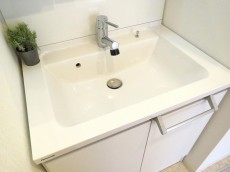 洗面化粧台は清潔感のあるホワイト。鏡の裏は一面収納になっており、ゴチャゴチャ散らかりがちな小物類もスッキリ仕舞えるようになっています。