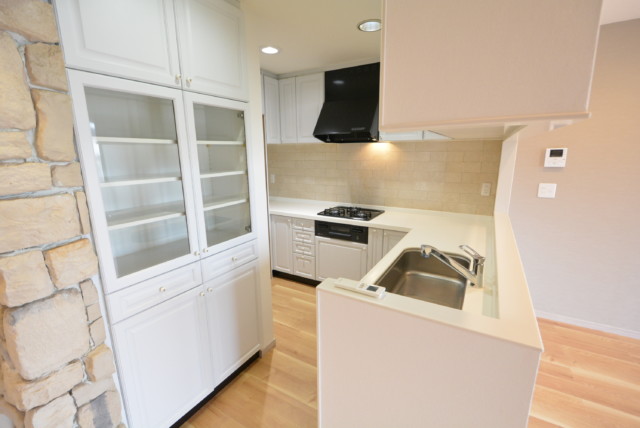 L字型のカウンターキッチン。調理台は白一色で清潔感いっぱいです。扉の飾りも素敵ですね。