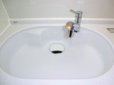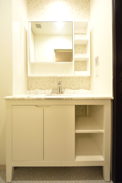 スタイリッシュな洗面化粧台は、三面鏡の裏がキャビネットになっているので