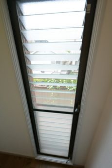 廊下突き当りには北側のバルコニーに面したルーバータイプの窓がありました。取っ手をくるくる回すと細長いガラスの角度が変わる窓です。左に曲がると突き当りには洗濯機スペース。通路にランドリーボックスなどを置くなら、キャスター付きなどにすると邪魔にならなくていいかもしれません。