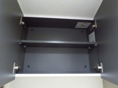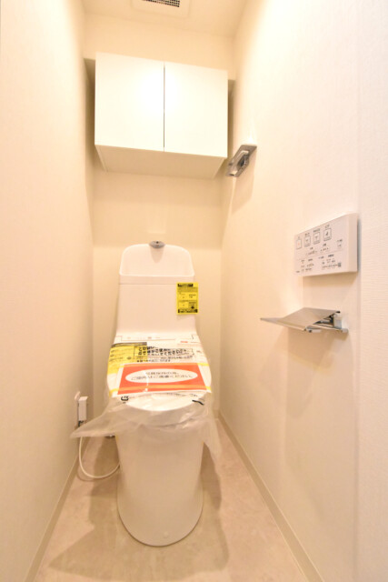 廊下を進んですぐ左側の扉はトイレ。ウォシュレットとペーパーのストックの保管に便利な吊戸棚が設置されています。