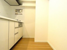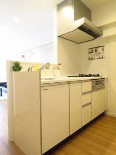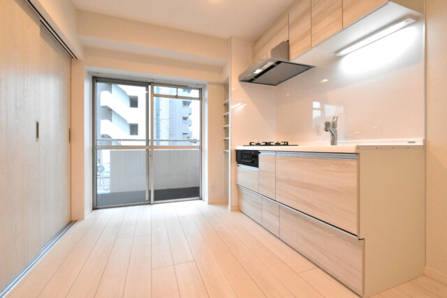 キッチンは壁付けタイプ。省スペースでお部屋を広く使うことが出来ます。調理台のパネルに建具とお揃いの白木調を使うことで、お部屋の雰囲気によく合っていますね。