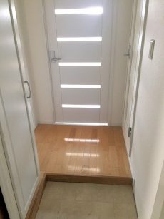 玄関からは真っすぐ伸びる廊下は明るいフローリングと白のクロス。建具も白木風でナチュラルな雰囲気ですね。最近はバリアフリーの流れで段差の小さい上り口が多いなか、しっかりと高さがあって靴を履く時に腰掛けたりに便利です。
