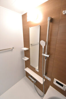 浴室はブラウン木目調のアクセント。光沢がないのもいいですね。寛ぎのバスタイムにピッタリの落ち着いた雰囲気です。