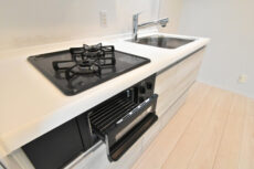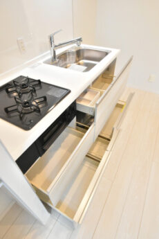 キッチンは清潔感のあるホワイト。水栓は浄水機能付き、コンロは3口ガスコンロです。シンク下の収納には大きなお鍋やフライパンもすっぽり仕舞っておけそうです。