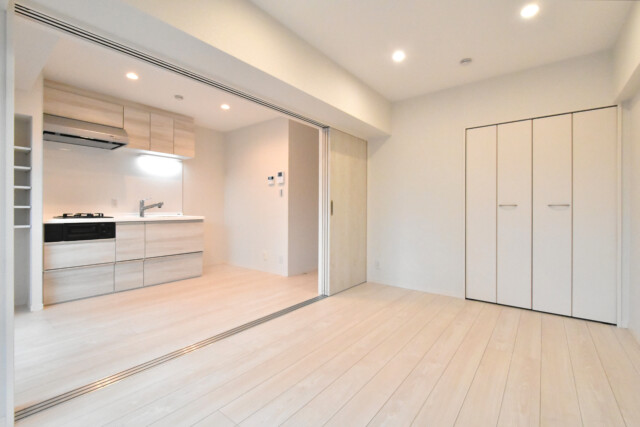 LDKに隣接した洋室へ。LDKとは3枚の可動扉で仕切れるようになっています。
