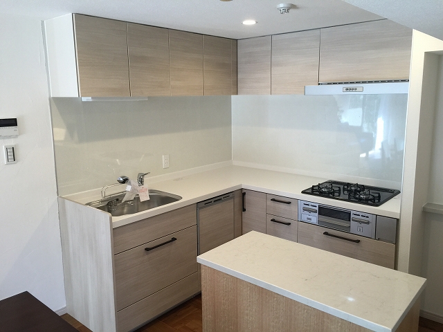 広々とした人造大理石のワークトップと大きなシンクも嬉しいです。L字型のキッチンはあまり動かず、いろんな所に手が届きますので、嬉しい造り♪♪