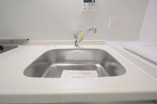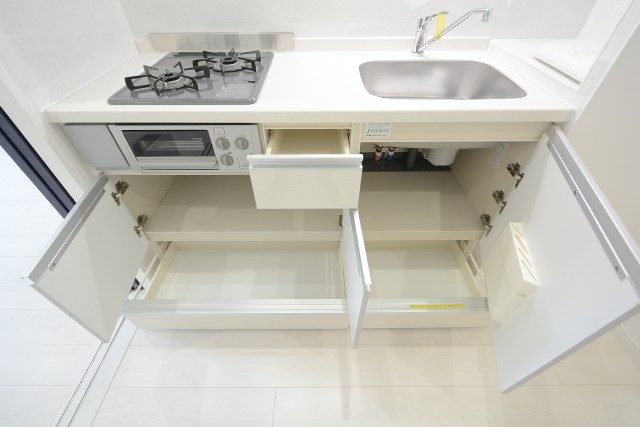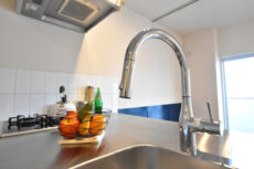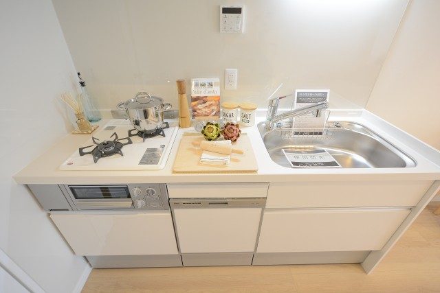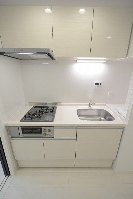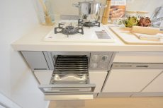 コンロは2口、グリル付き。グリルってお掃除が面倒であまり使わない方も多いと思いますが、そんな方にお勧めなので「グリラー」です。蓋の付いた陶器皿のようなもので、これを使うとグリルがほぼ汚れないとか。グリルだけでなく電子レンジや直火でも使える点も秀逸ですよ。水栓はおしゃれかつ使いやすいグースネック!