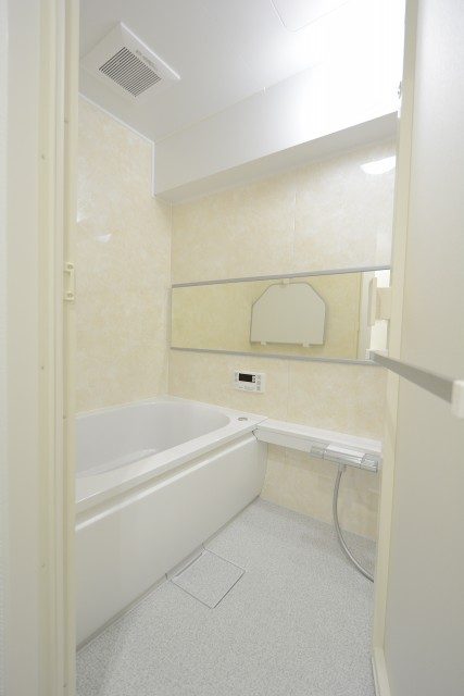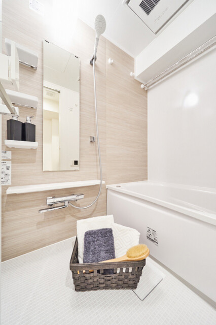浴室はベージュのアクセントパネルを使用した温かみのある雰囲気。浴室換気乾燥機が付いているので、天気を気にせず洗濯機を回すことが出来ますよ。匂いが・・・と言う方もいらっしゃると思いますが、最近は室内干し用の洗剤などいろいろ良いものが発売されてますので是非一度お試しを!