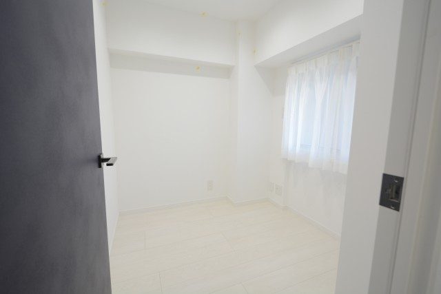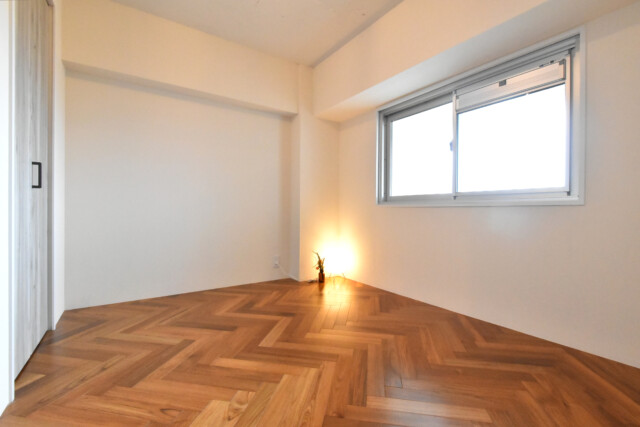 北向きの窓のあるお部屋です。北向きって暗いイメージがありますが意外と明るいんですね。フローリングはLDK と同じヘリンボーン柄ですが、他がシンプルなので合わせる家具やインテリアによっていろいろな雰囲気に出来そうです。