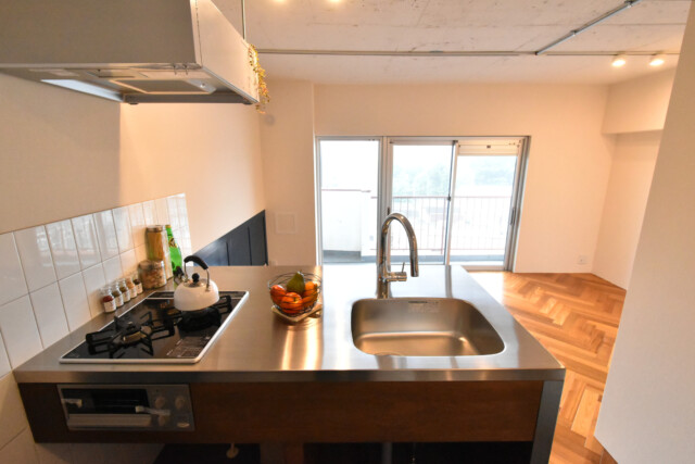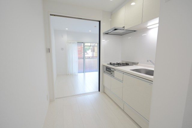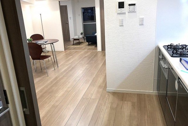 入ってすぐにキッチン、その向こうがリビングダイニングになったワイドスパンのお部屋です。窓は南向きのバルコニーに面していてとても明るいですよ。廊下途中からのフロアタイルがそのままキッチンまで続いています。