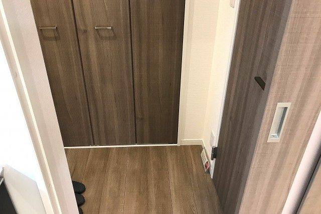 出てすぐの所には収納があります。棚やハンガーパイプなどが設置されていないフリーのスペース。スティッククリーナーのような高さのあるものも入りますし、スーツケースなどの嵩張るものも入ります。入れるものに合わせてカスタマイズして使いましょう。