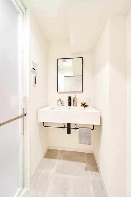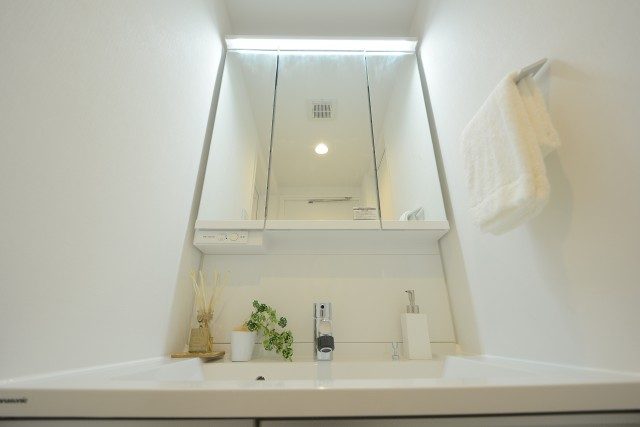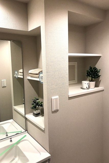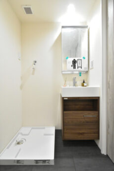 洗面室には洗面化粧台の他に、洗濯機スペースと浴室がまとまっていて脱衣所も兼ねています。シンプルなデザインの洗面化粧台ですがミラーの裏にはキャビネット付き。洗面周りに散らかりがちな細々したものもスッキリ収納可能ですよ。
