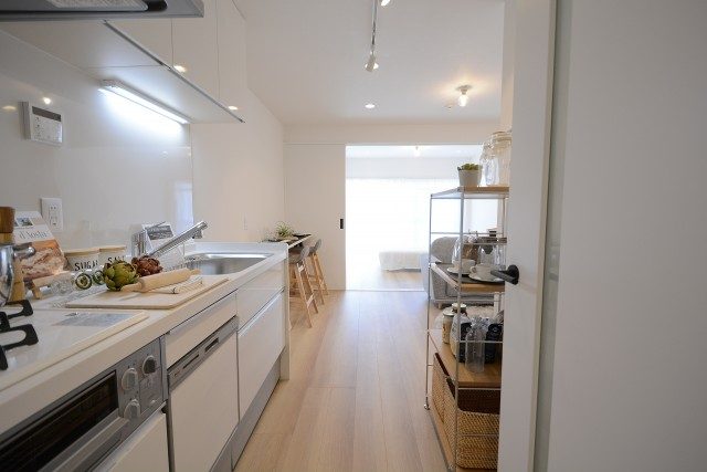 開放的で調理中の会話もスムーズ、リビングのテレビを見ながらの料理なんかも可能ですよ。キッチン内が目立たないという特徴もあり、片付けに自信のない方の味方です(笑)