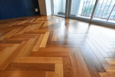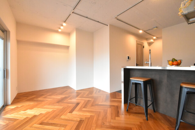 リビングダイニングは廊下と同じヘリンボーンのフローリング。濃淡がはっきりした組み合わせで、クラシカルで重厚な雰囲気になっています。打ちっ放しのような仕上げの天井に設置された、シンプルなダクトレールもイイ感じですね。模様替えの時などに、気軽に照明の位置や種類を変えられるのもダクトレールのいいところです。