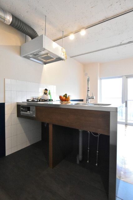 広めのキッチントップにスツールを置いてダイニングテーブル代わりに。あまり家で食事をしない方ならこれでも十分ですよね。ライフスタイルによってメリハリを付けるのって大事だと思います。