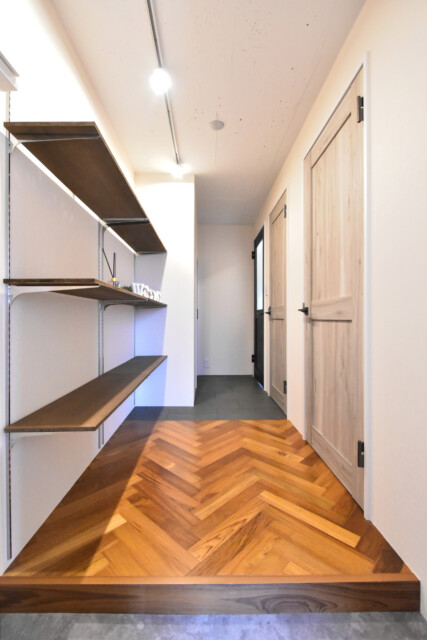 廊下はヘリンボーンのフローリング。途中からダークグレーのストーン調フロアタイルに切り替えられています。棚がオープンなことによって、廊下の幅がかなり広く感じられますね。入った時の第一印象が全然違います♬