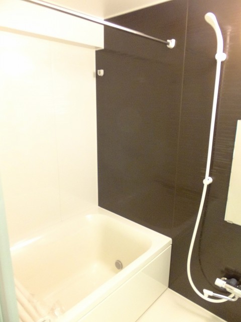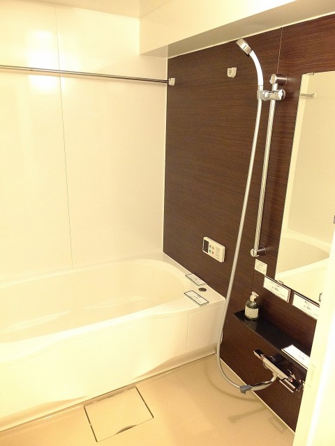 お風呂はダークブラウンのパネルを使っていて、落ち着きのある空間でした。