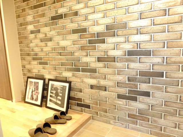 玄関を開けてまず目に飛び込んでくるのが、このレンガ造りの壁です。もちろんウォールペーパーではなく、本物ですよ(・o・)