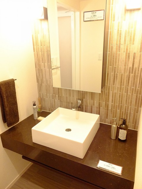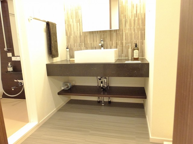 洗面台はとってもオシャレ☆全体的に少し落ち着いたトーンです。鏡の裏側が収納スペースになっています。