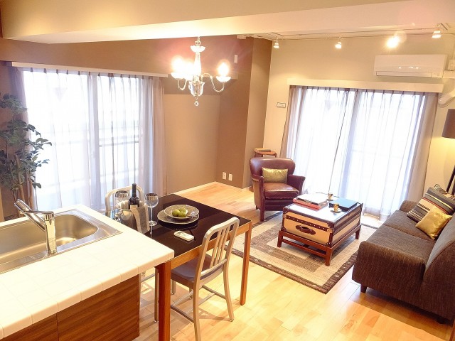 このお部屋はキッチンを中心にリビングダイニングが広がっているかのように、キッチンを主役にしています。