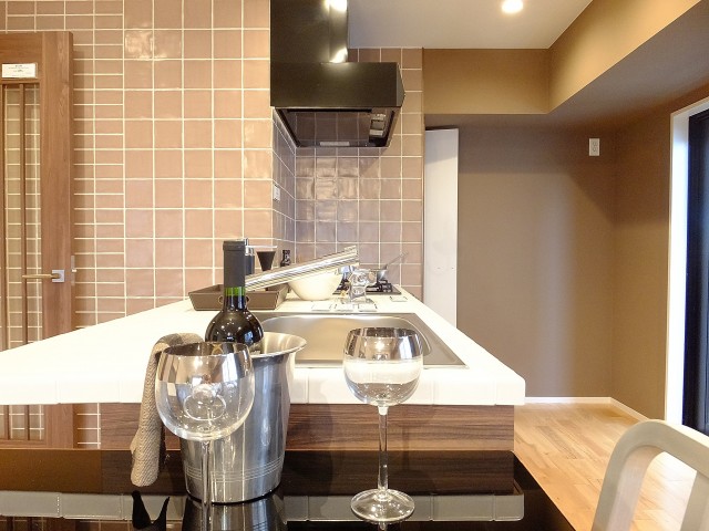 キッチンの天板は白いタイルになっていて、オシャレ&お掃除ラクラク☆カウンターも付いているので、椅子を並べればバーカウンターの出来上がり♪