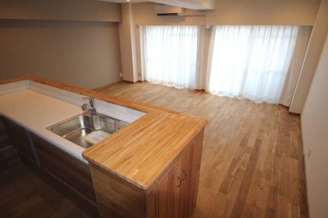 キッチンカウンターも無垢材が貼られており、まるで家具のような佇まいです。
