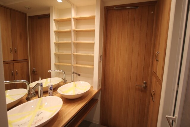 玄関を上がって廊下を左手に進むと洗面室があります。人数が多いご家族には嬉しいダブルボウルです。朝の洗面室は集中的に混雑しがちですが、ダブルボウルはそれを解消してくれます!リネン庫や収納も充実した洗面室です。
