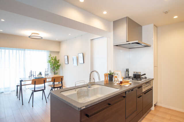 ところで、キッチンカウンター上部には梁型がありますが、ちょうどリビングダイニングとキッチンの間にあるため、ゾーニングの役割を果たしているような感じがしてあまり気になりませんよ!